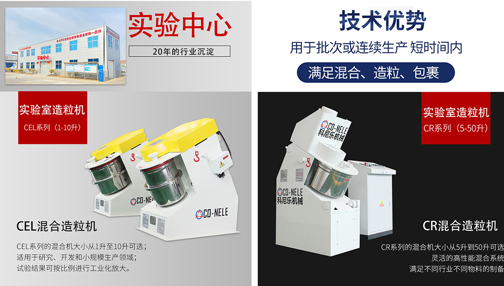科尼乐CR混合造粒机通过强逆流原理实现设备的成球率高、颗粒大小均匀的优势,可以对造粒时间与造粒均匀度进行高效控制。
